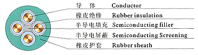 4、UPQ型電纜3帶絕緣屏蔽主線芯和包覆半導電橡皮層線組,圍繞半導電橡皮層墊芯絞合纜。外擠包黃色氯化聚乙烯橡皮護套或黃色氯丁橡皮護套。